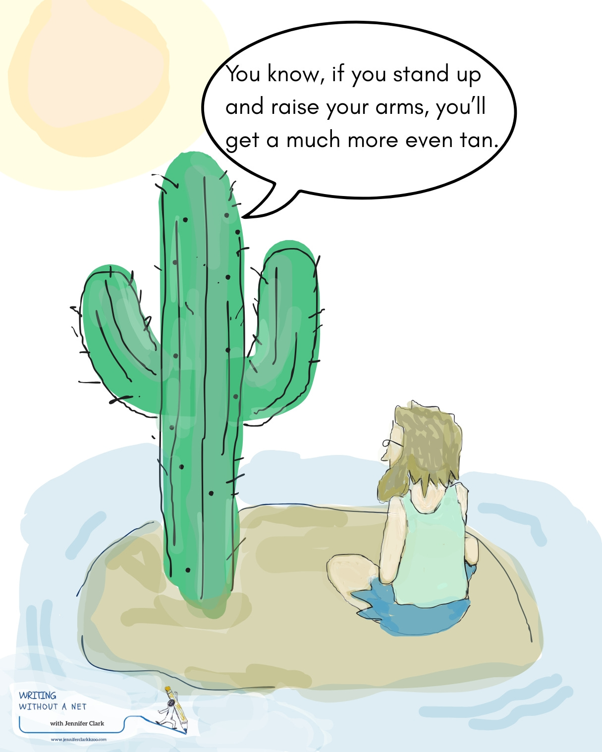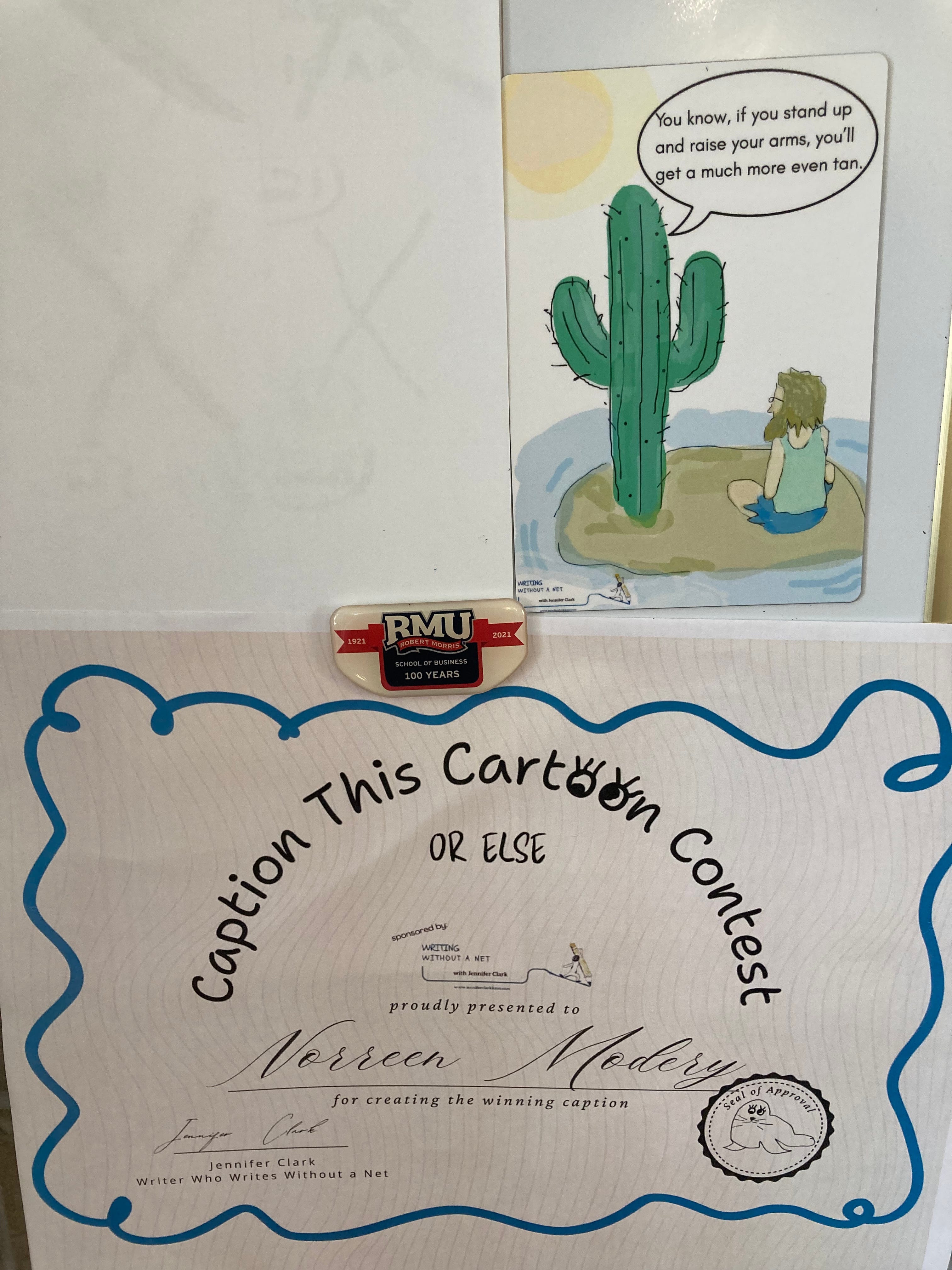 Norreen Modery of Bethel Park, Pennyslvania, is our newest winner of Caption This Cartoon (Or Else) Contest! Her caption—You know, if you stand up and raise your arms, you’ll get a much more even tan—beat out some seriously funny competition.