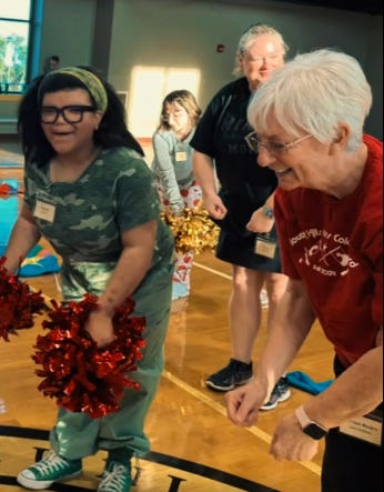 After my boss died and I lost my job, I was wondering how I could use my skills as a cheerleader and majorette now that was 80 years old. Around that time, I read in the paper that a special needs color guard group was starting up and needed volunteers. Because I danced, cheerleaded, and did baton, I thought I could help out. I’m now in my fourth year of volunteering with the South Hills Stars Special Needs Color Guard Group.