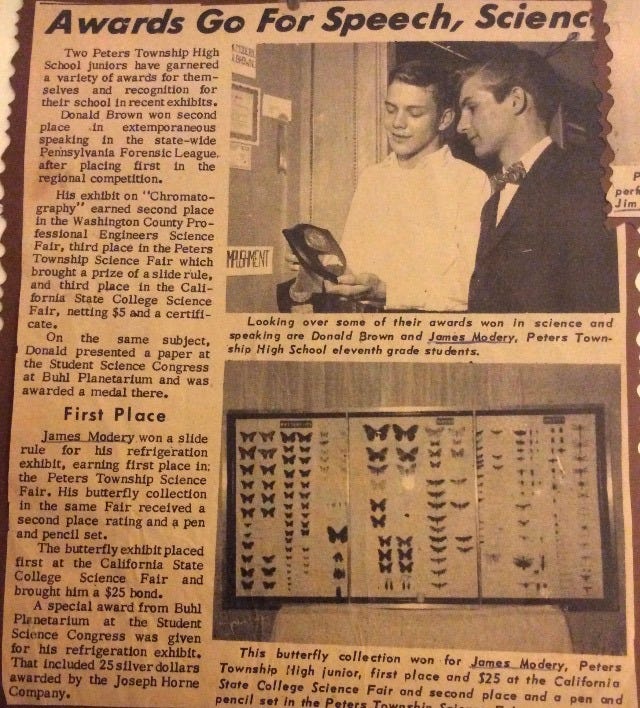 But bingo isn’t a contest. I just got lucky numbers is all, so technically, I haven’t won a contest until now. My husband, Jim, on the other hand, is the real contest winner. He once entered a radio contest and won us an all expense weekend at Seven Springs Mountain Resort in the Laurel Highlands. It was an A.M. radio station, so it probably didn’t have lots of listeners, so we were lucky. And when Jim was a junior in high school, he won a medal, a slide rule, and 25 silver dollars from Buhl Planetarium for his refrigeration project. That same year, he also won five dollars and a certificate from California State College for his butterfly display.